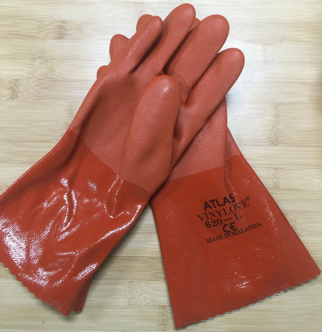 Atlas 620 Large Gloves. Twice dipped, orange, 12″ knit lined PVC.