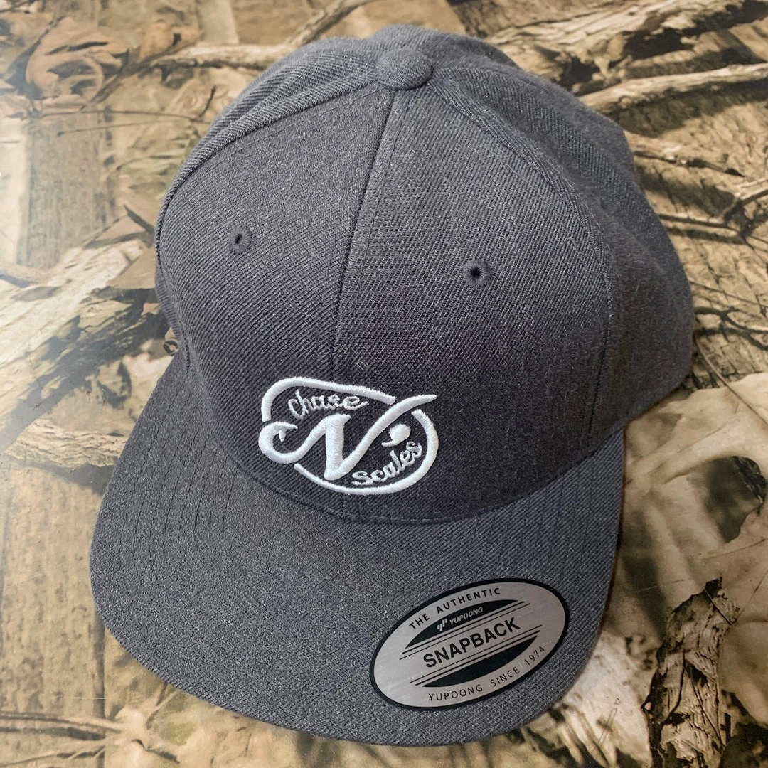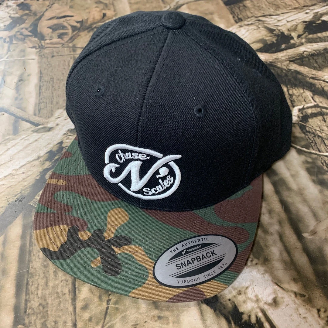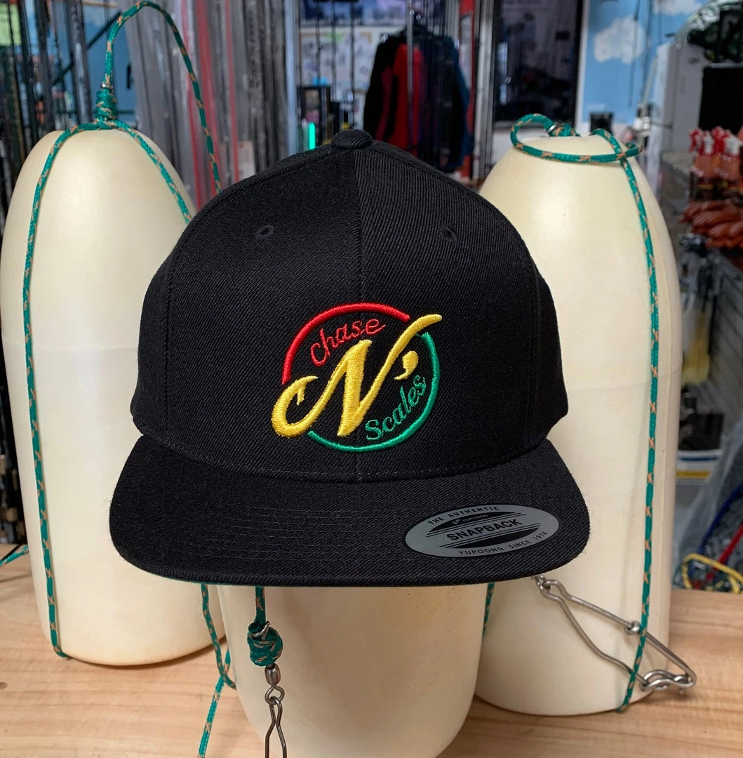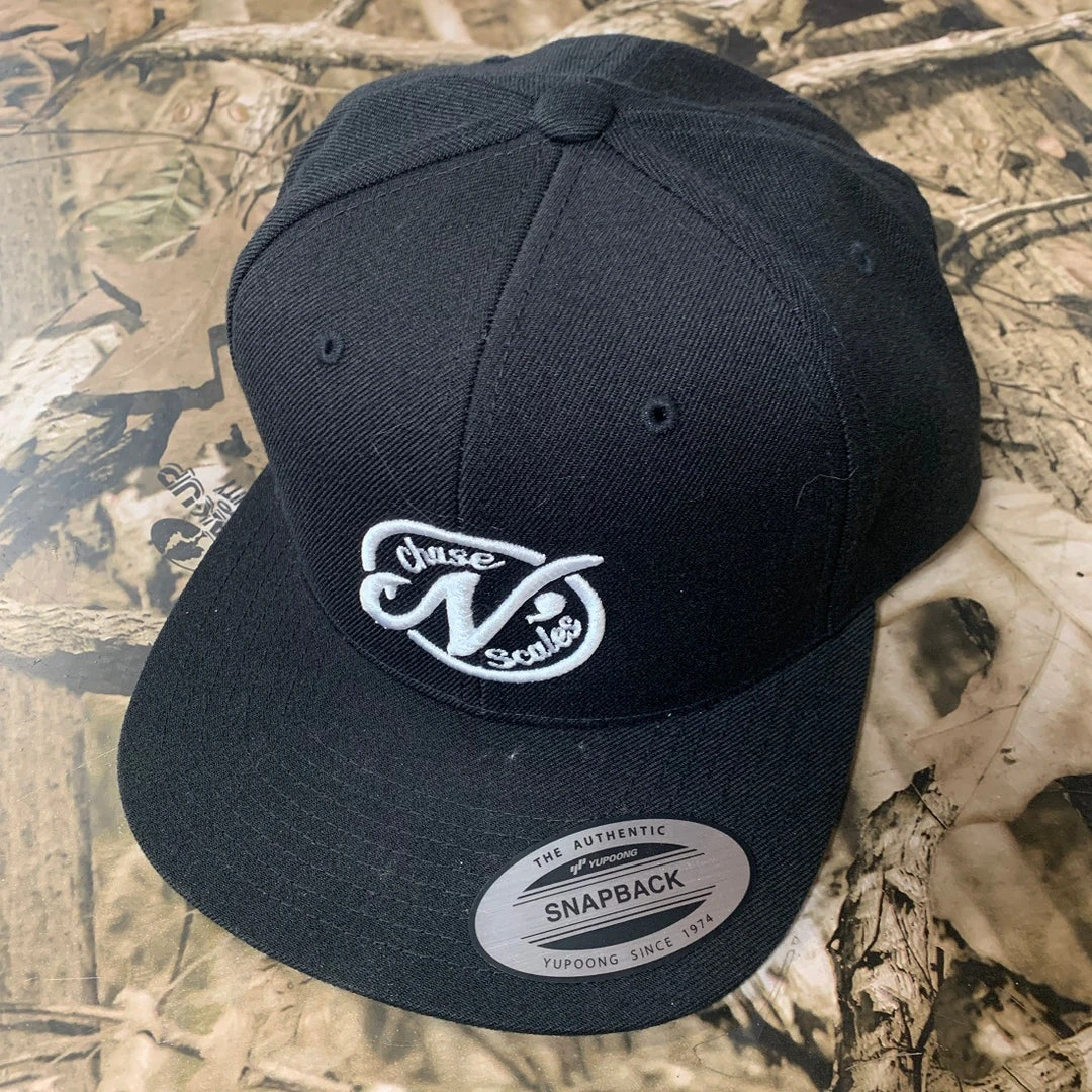 Embroidered logo on black Buckram backed panel, flatbill snap-back.