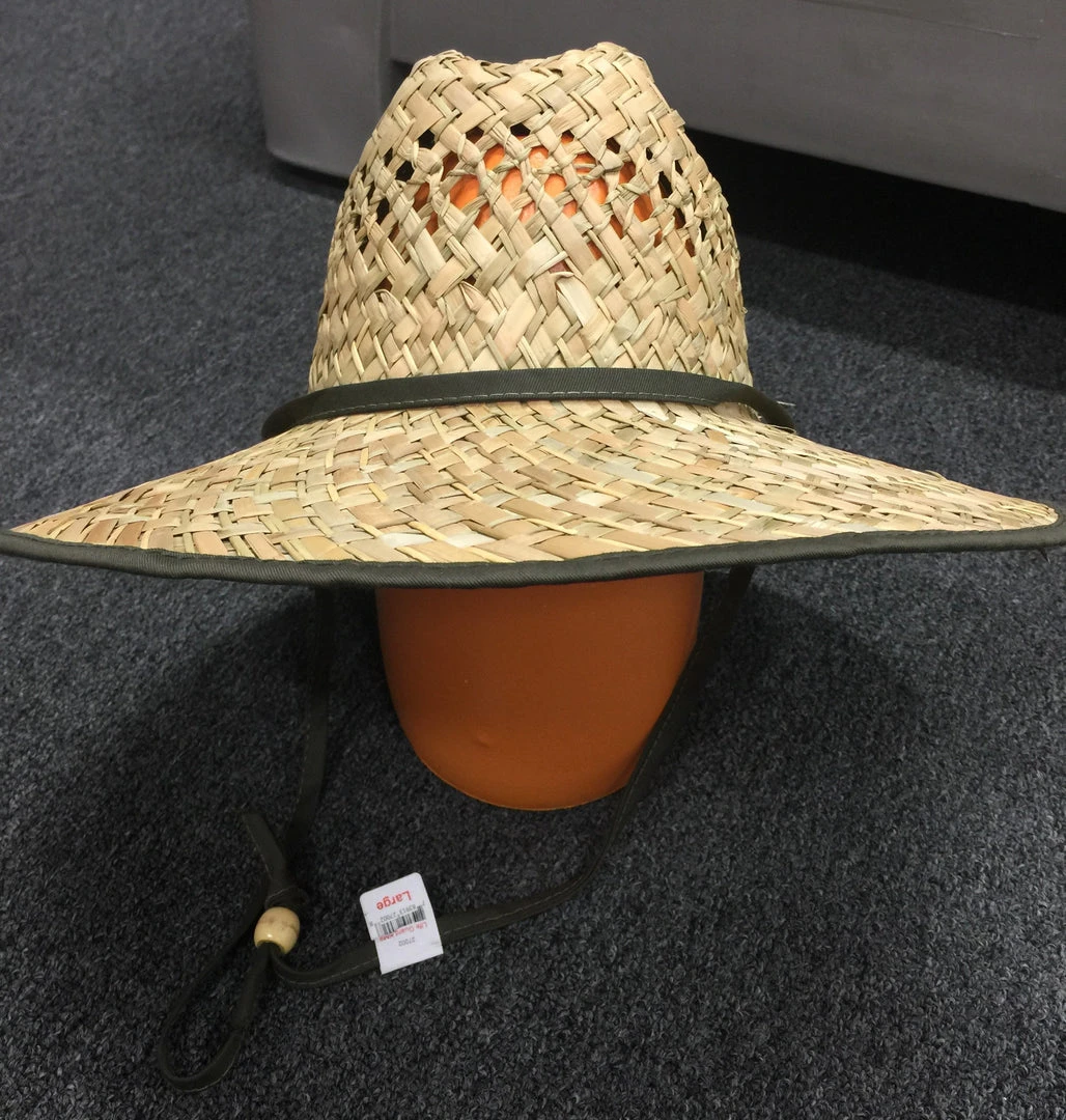 17″ wide brim, lightweight hand-woven straw Fisherman’s hat with cinching chin strap.